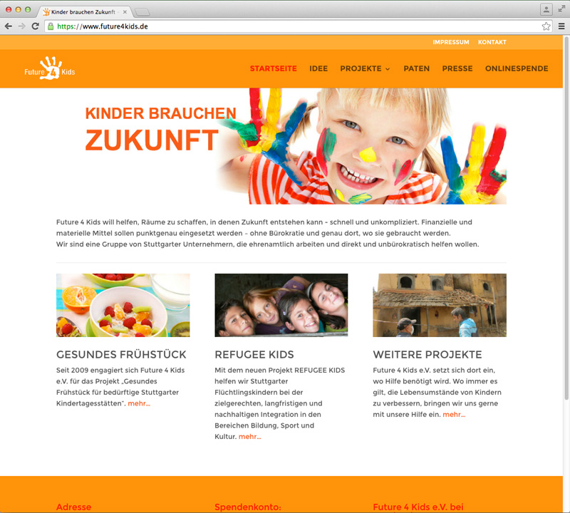 Völlig unentgeltlich erarbeiteten die Kreativen das Layout für den Relaunch der Webpräsenz und realisierten darüber hinaus auch einen Flyer. Future 4 Kids mit Sitz in Stuttgart wurde 2006 von einer Gruppe von Unternehmern gegründet, die sich in ihrer Hilfe ausschließlich ehrenamtlich engagieren.