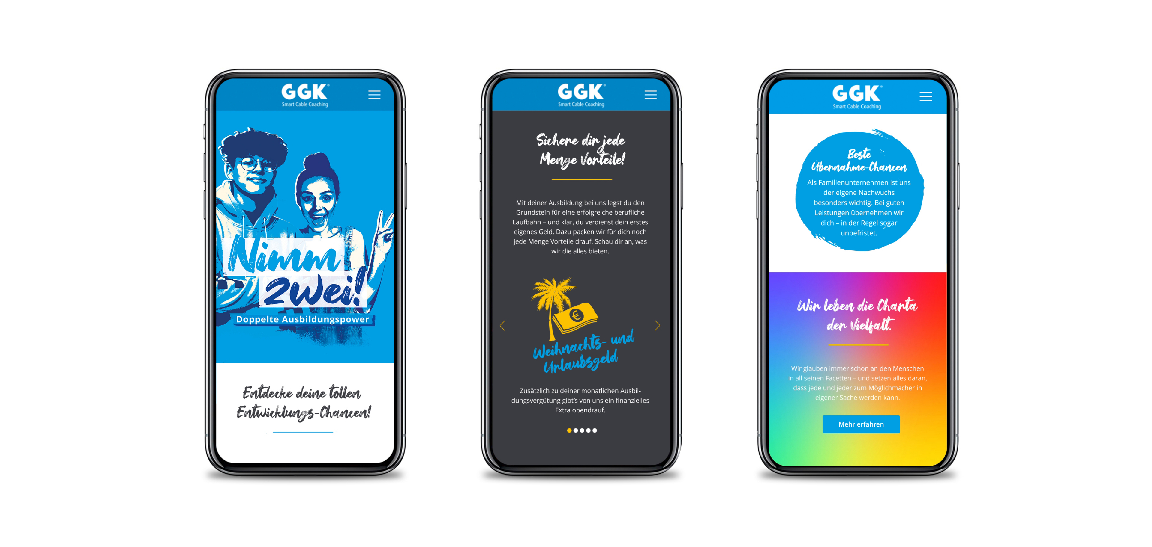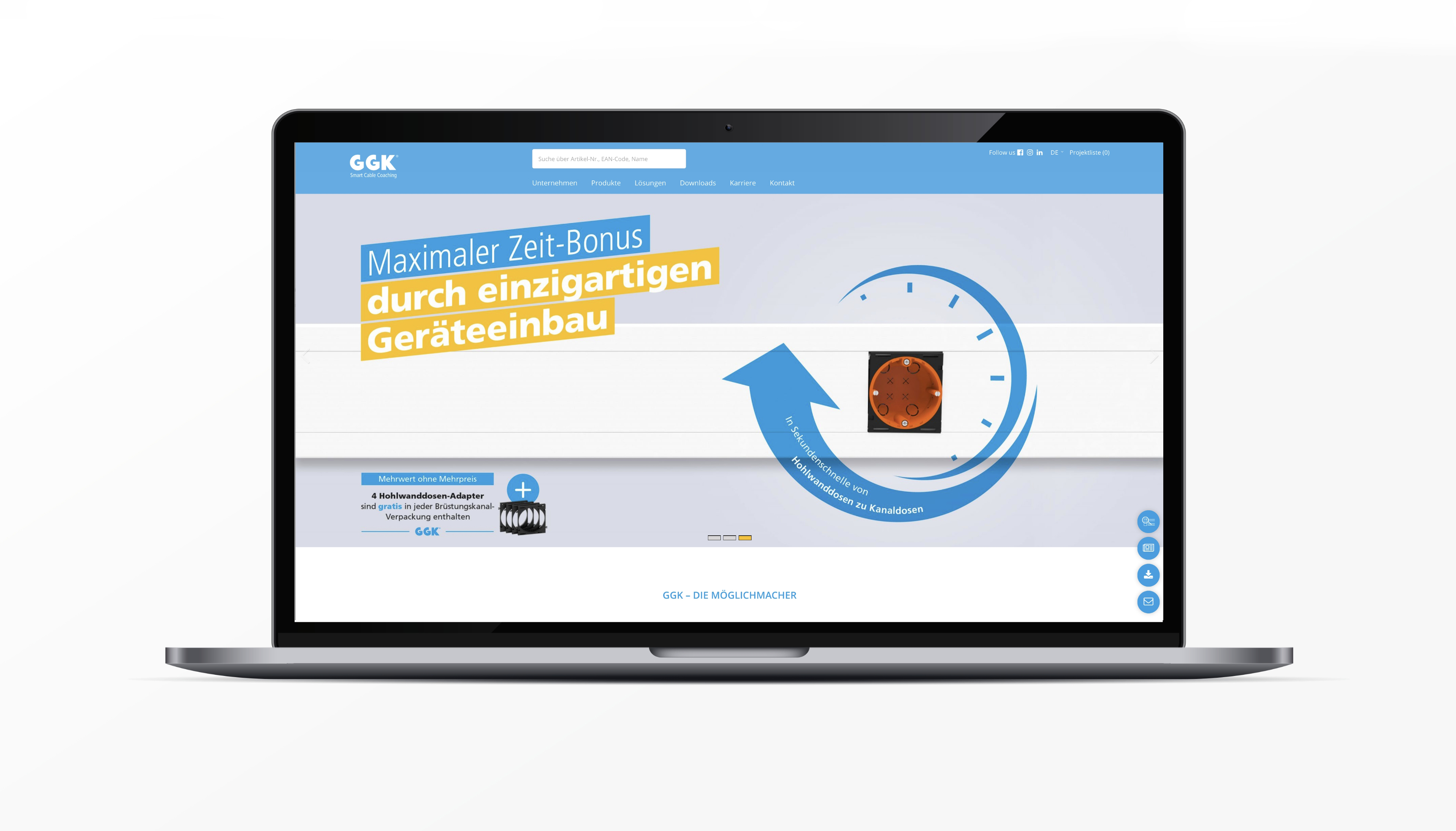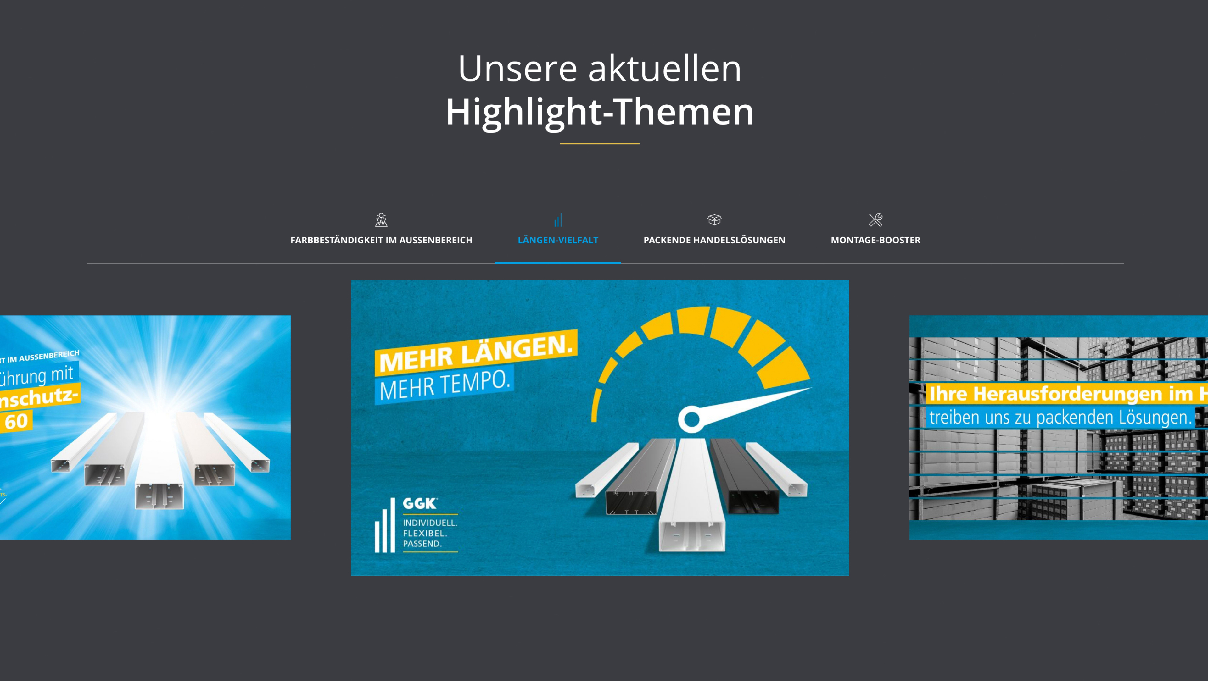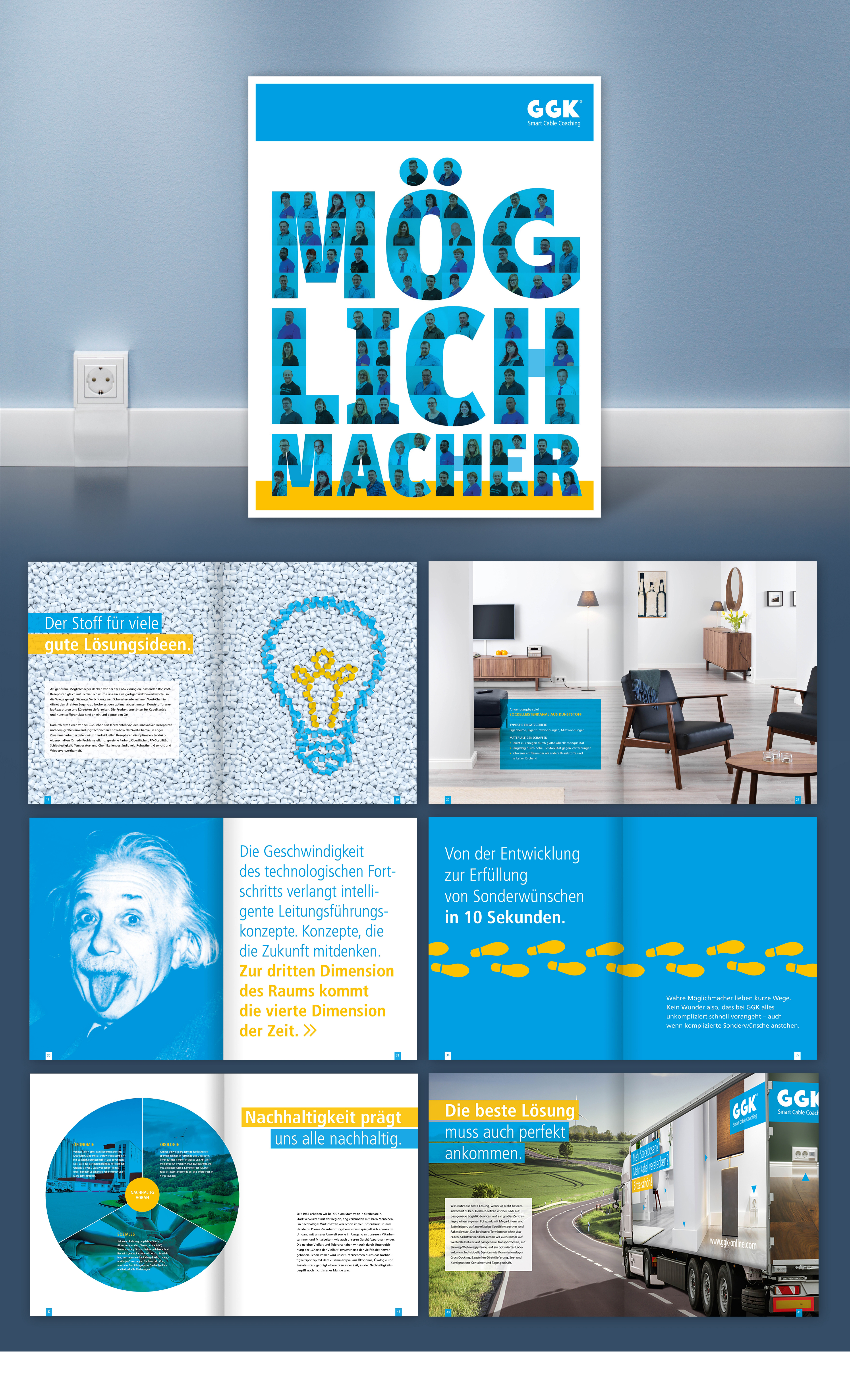Wie kann der David im Reich der Goliaths den Markt aufmischen? Diese Frage steht am Anfang unserer Zusammenarbeit mit GGK, dem Spezialisten für Aufputz-Elektroinstallationen. Im Markenworkshop werden wesentliche Stärken herausgearbeitet. Im Zentrum steht die extreme Flexibilität von GGK – die Fähigkeit, smarte Lösungen schnell und individuell umzusetzen. Auf Basis des geschärften Claims „Smart Cable Coaching“ füllen wir das Selbstverständnis der Möglichmacher von GGK mit Leben. Und wie es sich für einen David gehört, setzen wir auf eine Kommunikation, die sich deutlich von den Goliaths abgrenzt. Im Internet, in der Identitätsbroschüre, auf der Messe...